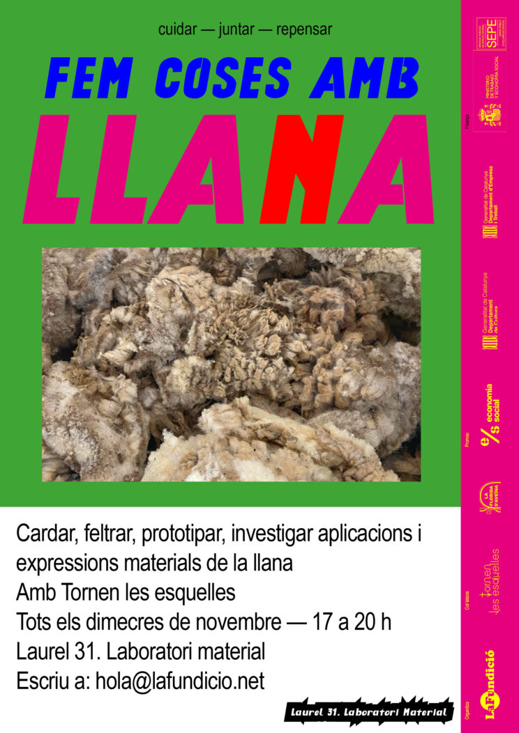 Ahora, durante todo el mes de noviembre, cada miércoles de 17 a 20 h, acompañadas por Tornen les esquelles, nos proponemos hacer cosas con la lana: cardarla, hacer fieltro e investigar qué aplicaciones, qué expresiones materiales y estéticas puede tener.