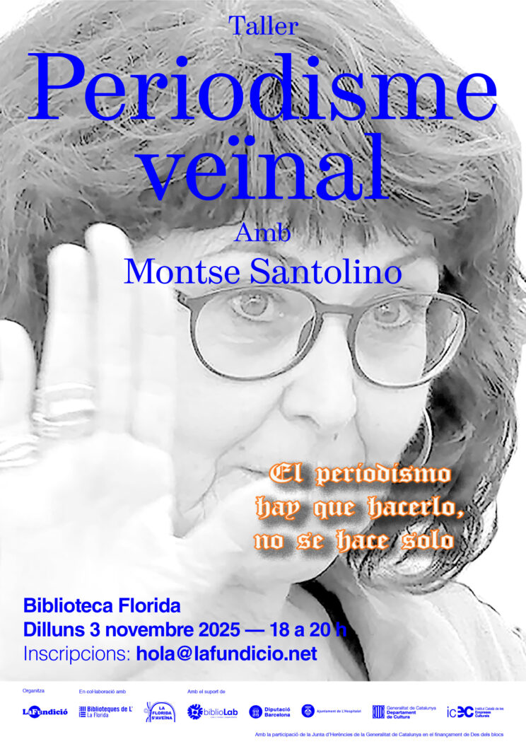 El lunes 3 de noviembre, a partir de las 18 h en la Biblioteca Florida, Montse Santolino, periodista y vecina de La Florida, compartirá algunas claves, recomendaciones, ideas prácticas y herramientas para hacer periodismo vecinal.